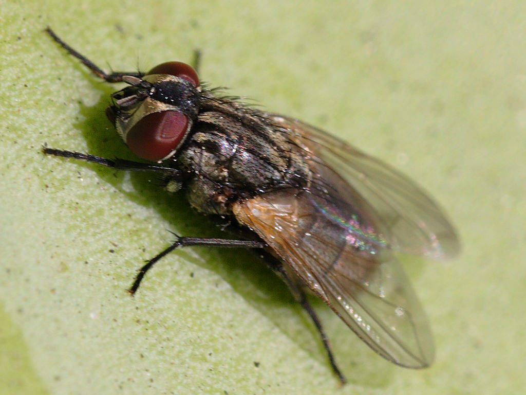 Physical Description: Household flies have the typical six legs and compound eyes of most insects as well as two wings on their back. Flies also have small hairs covering their back that act as taste receptors.